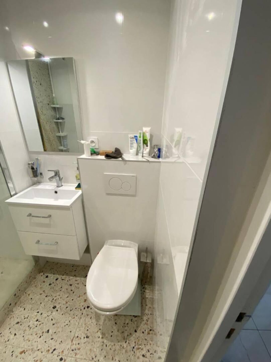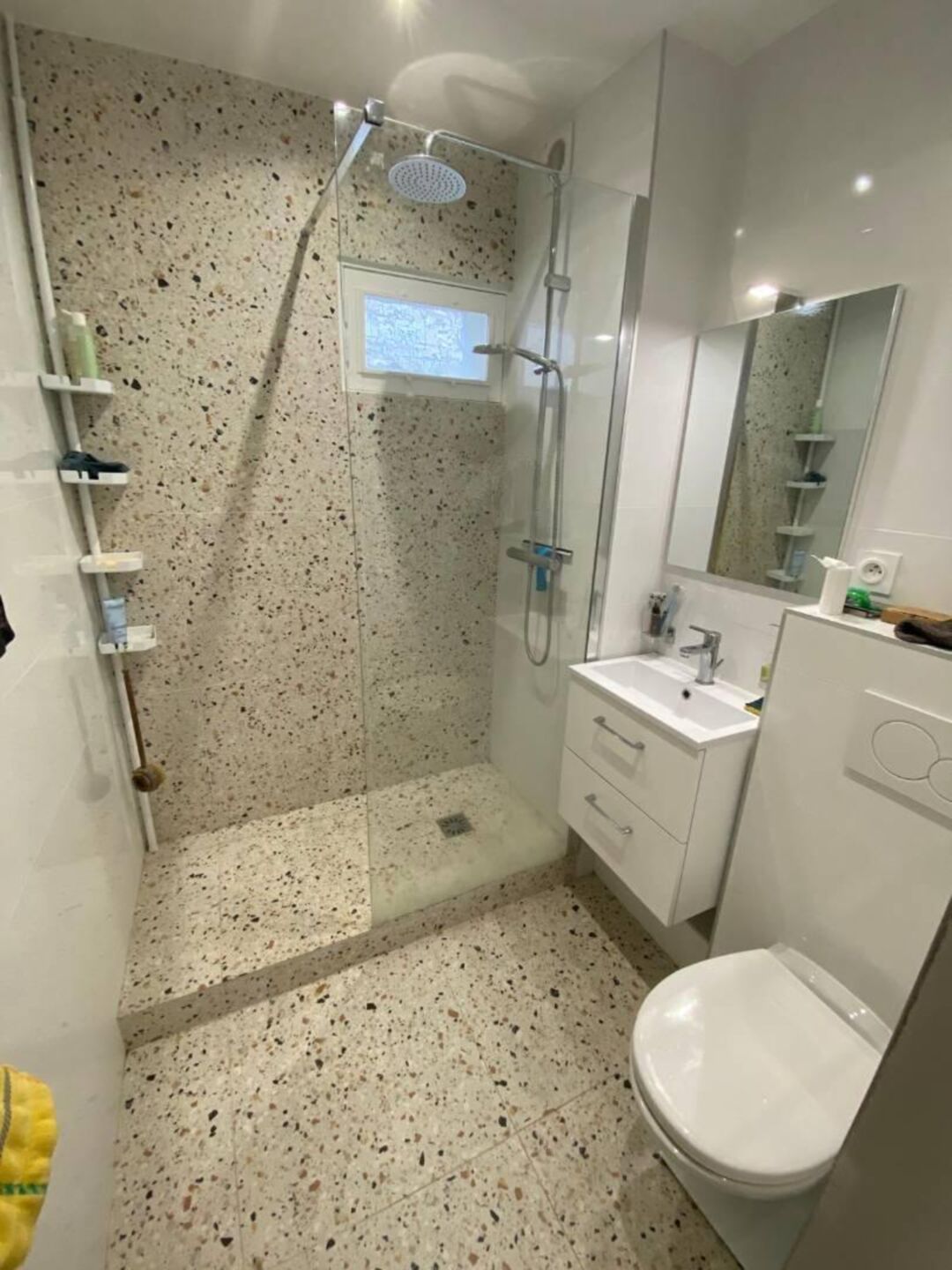 Côté aménagement, nous avons installé une douche à l’italienne spacieuse avec paroi en verre sécurisée, un meuble vasque suspendu avec rangements intégrés, ainsi qu’un nouveau WC moderne et économique en consommation d’eau. Le choix des matériaux haut de gamme, tels que le carrelage grand format au sol et faïence murale élégante, confère à l’espace un style contemporain et raffiné.